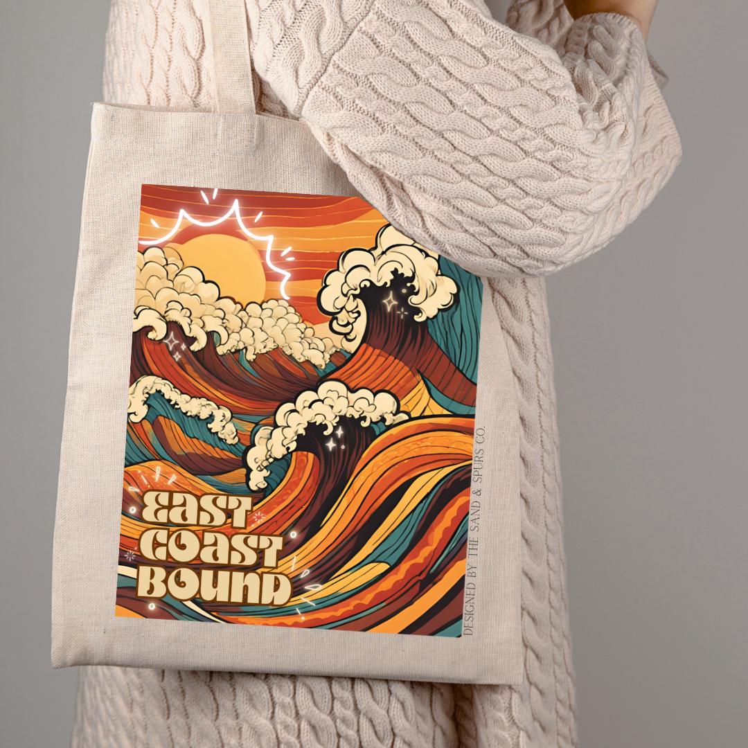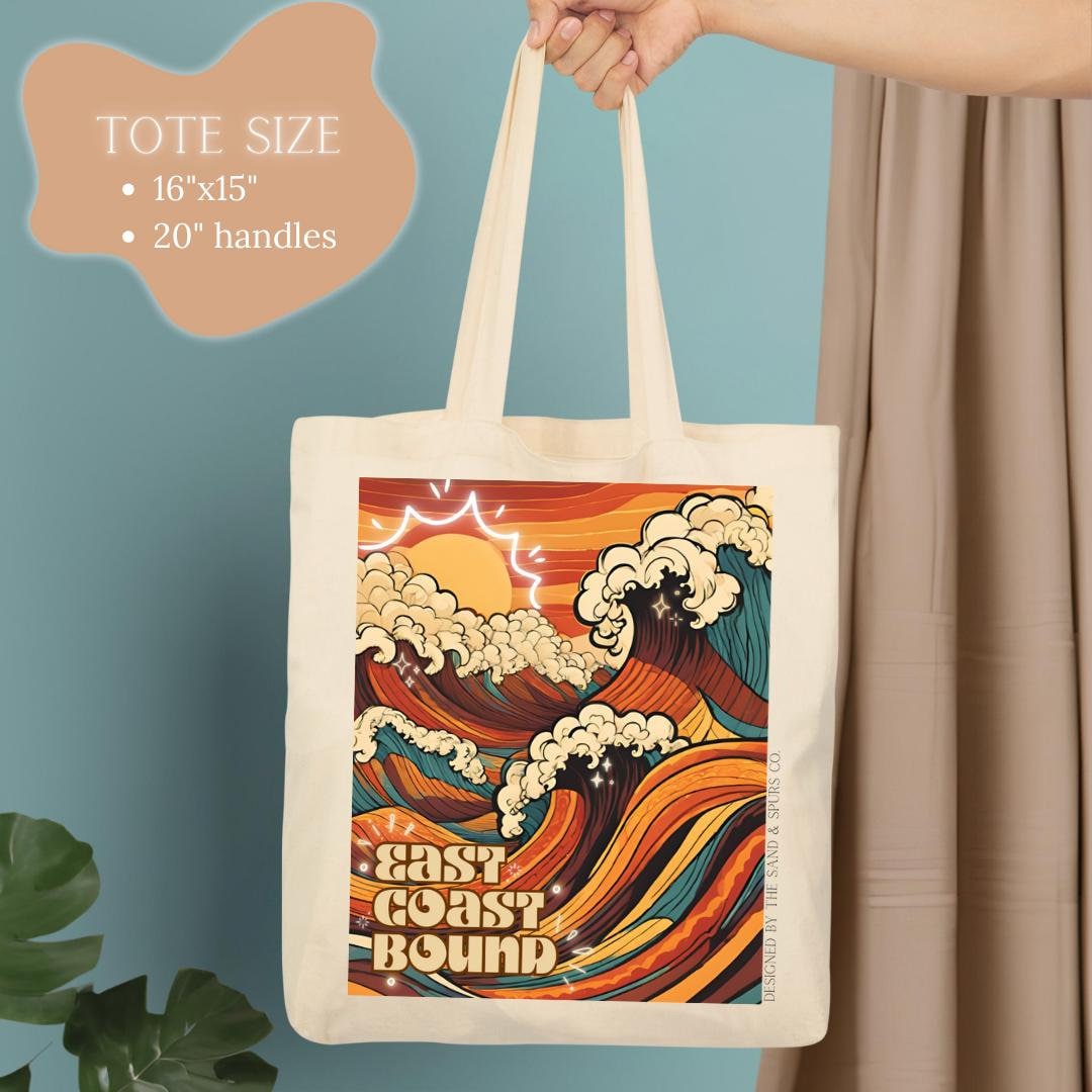 This rad "East Coast Bound" designed tote bag is 100% cotton that comes in one size – 15" x 16"– perfect for everyday wear. The canvas material shows off the design in great color, it's durable and will last for years. The tote bag features 20" handles (made from the same canvas), making it easy to carry journals or books.