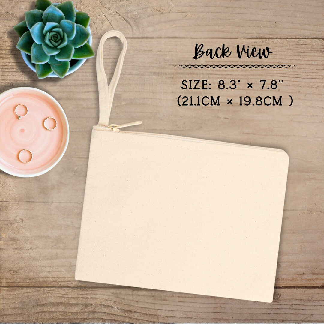 Keeping all belongings stylishly within arm's reach is this pouch's mission. It's 100% cotton fabric that feels like a an average cotton tote. This pouch comes with a quality zipper for secure closing and features a handy strap for effortless carrying.