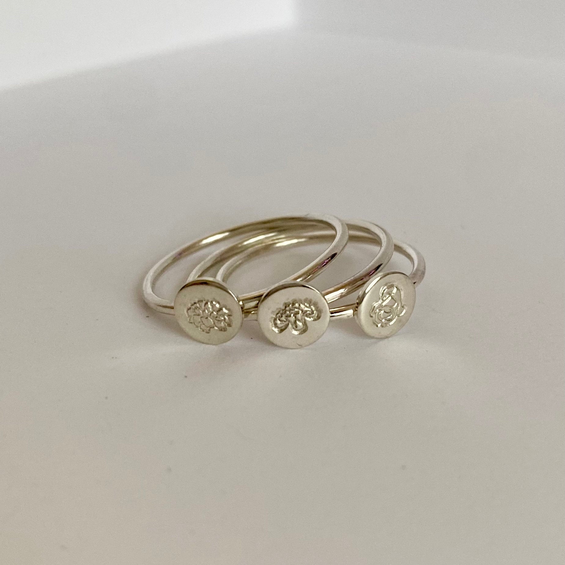 HOW TO PERSONALIZE: Select your preference of gold or silver along with your ring size in the drop down menu and add the item to your cart. Click on your cart, and scroll to the bottom where there is a "notes" box. Add in your month or flower you'd like stamped here.
