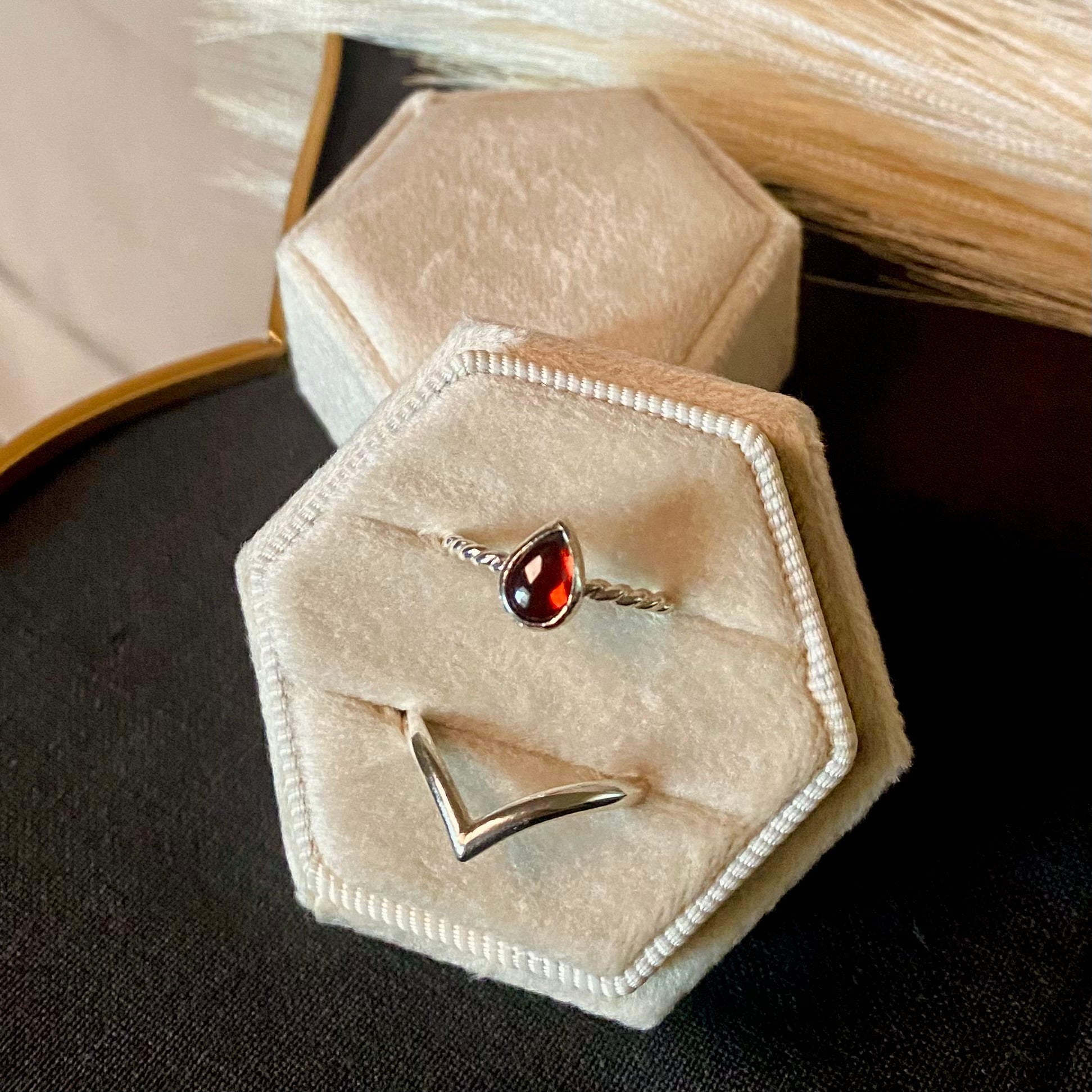 The ring set is a made to order item. The gemstone is a 5x7mm natural garnet cabochon set in a bezel 925 sterling silver setting. It is paired with a lovely chevron band to compliment the shape of the gem.