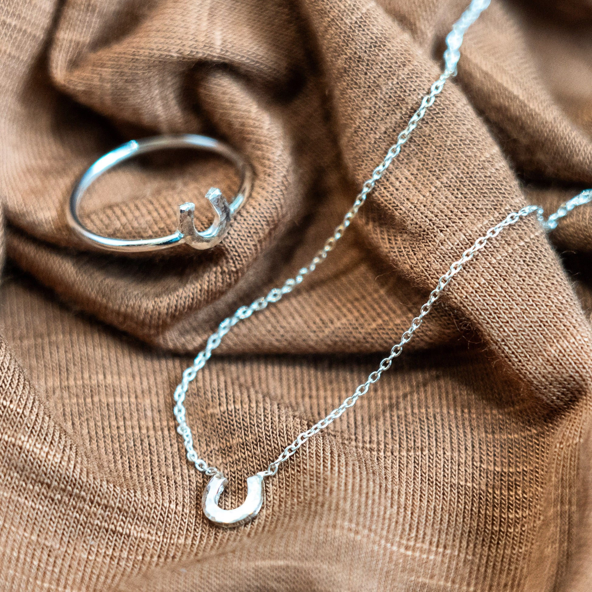 Western horseshoe jewelry set. The set is perfect for an everyday wear to match your country flare. This cute country style set includes a necklace, a ring and studs.. which are made of .925 sterling silver with a hammered style polished finish.