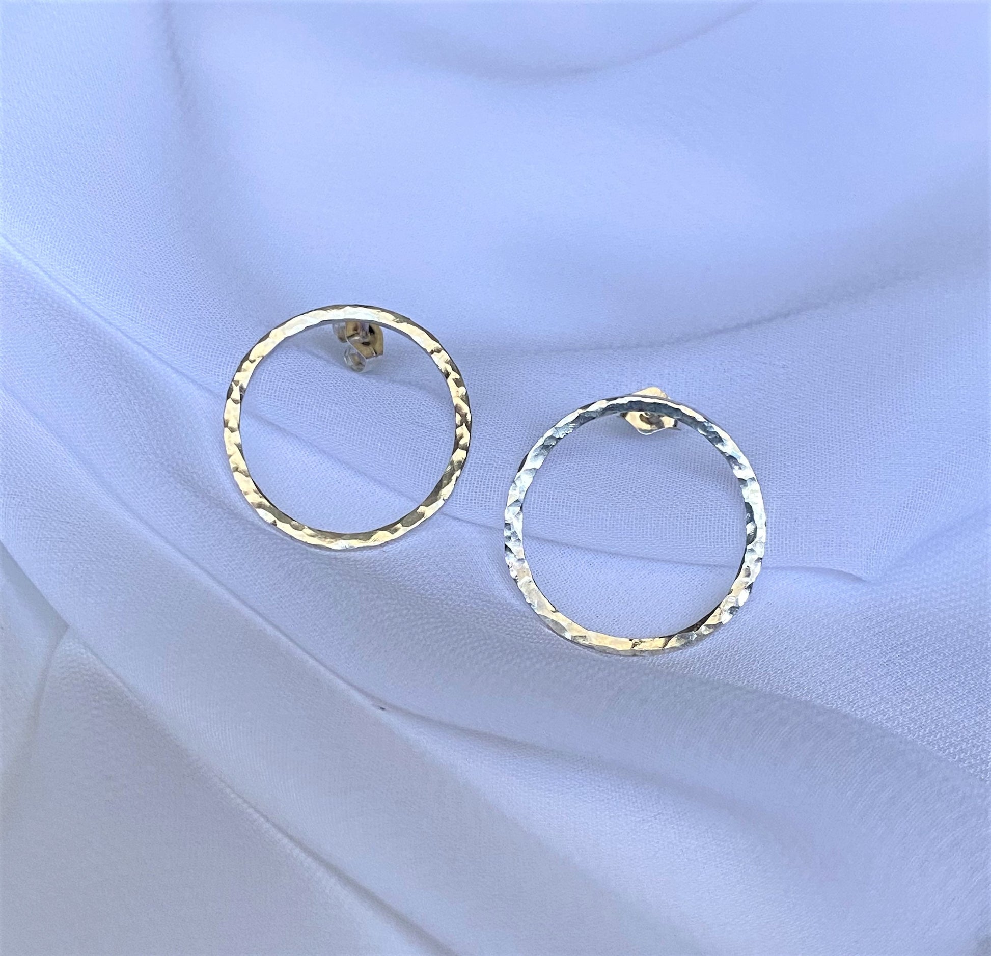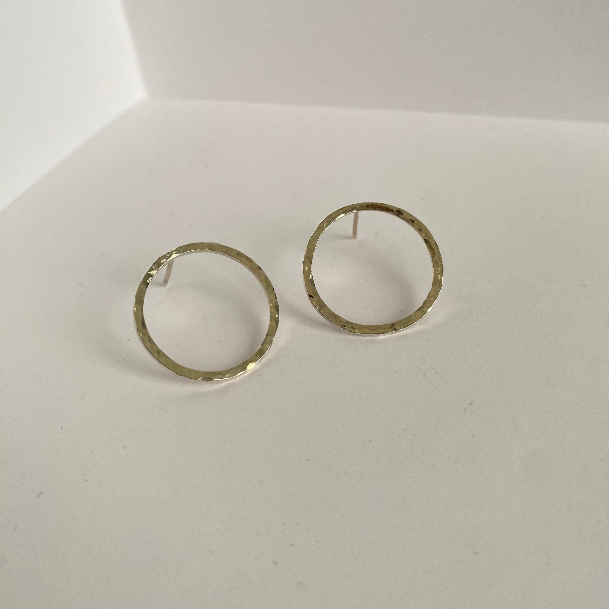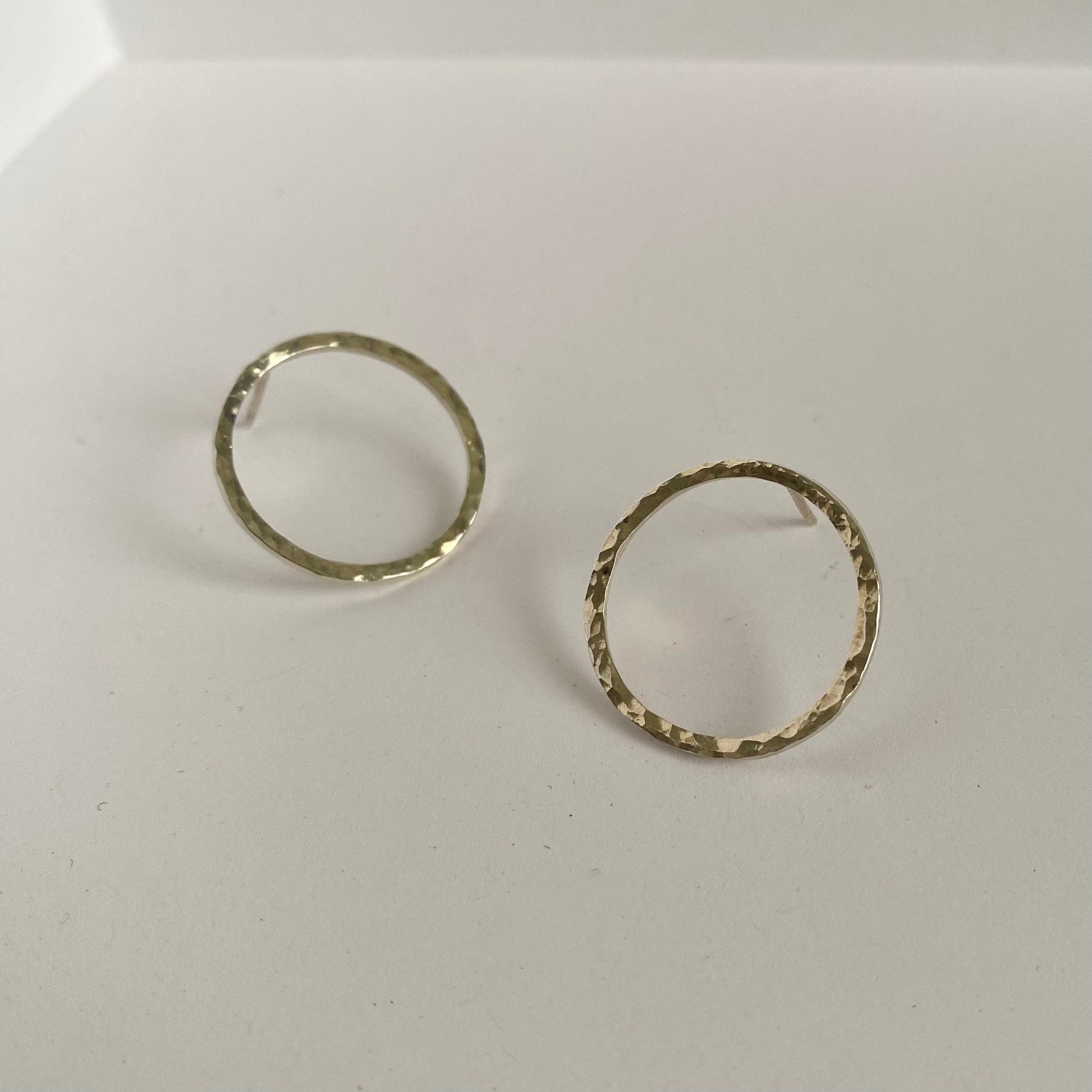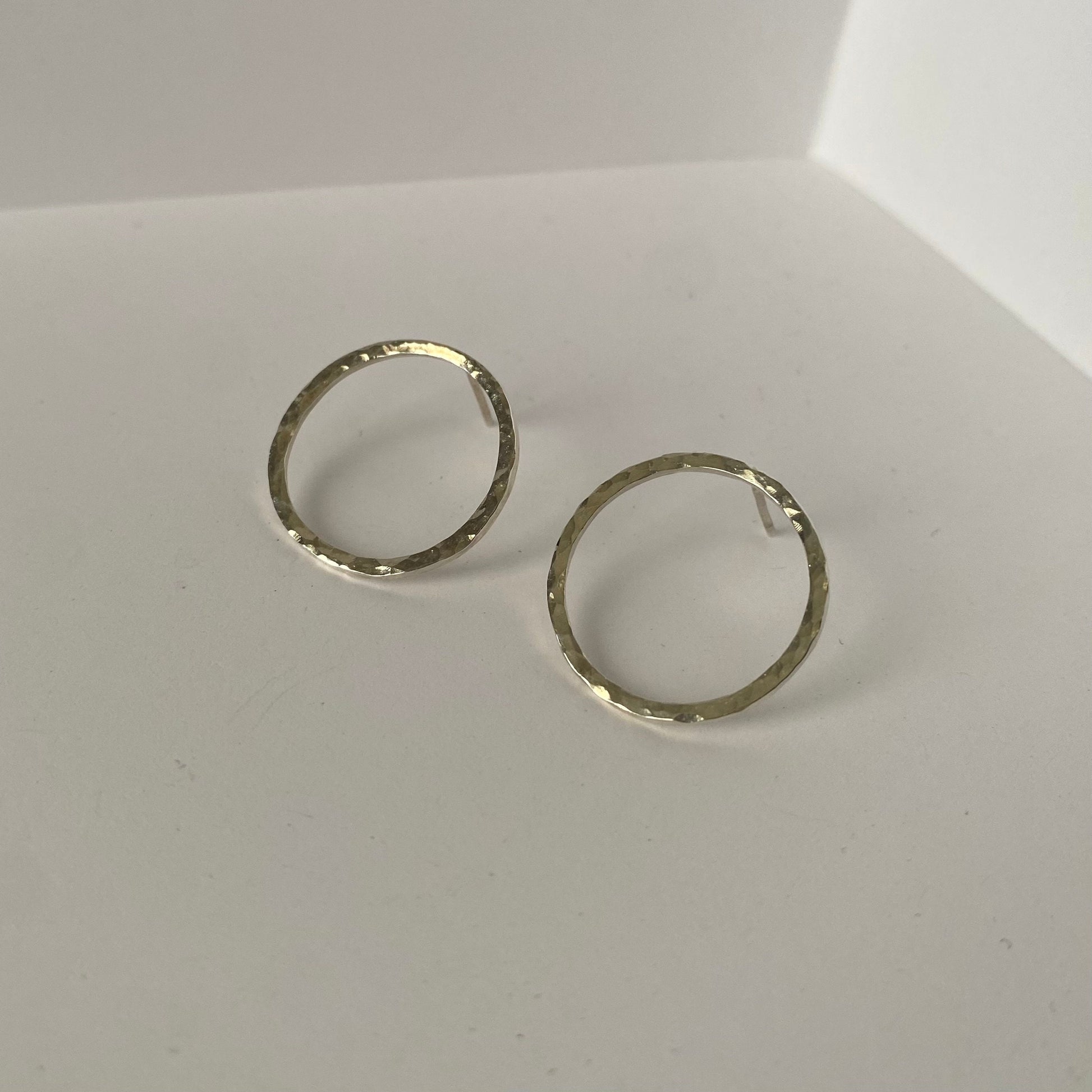 Simplistic and minimalist style earrings with a polished hammered design. The medium opened circle shape studs comes with a pair of earnuts. They’re very lightweight which feel very comfortable on the ears for everyday wear. The metal used is solid .925 sterling silver.