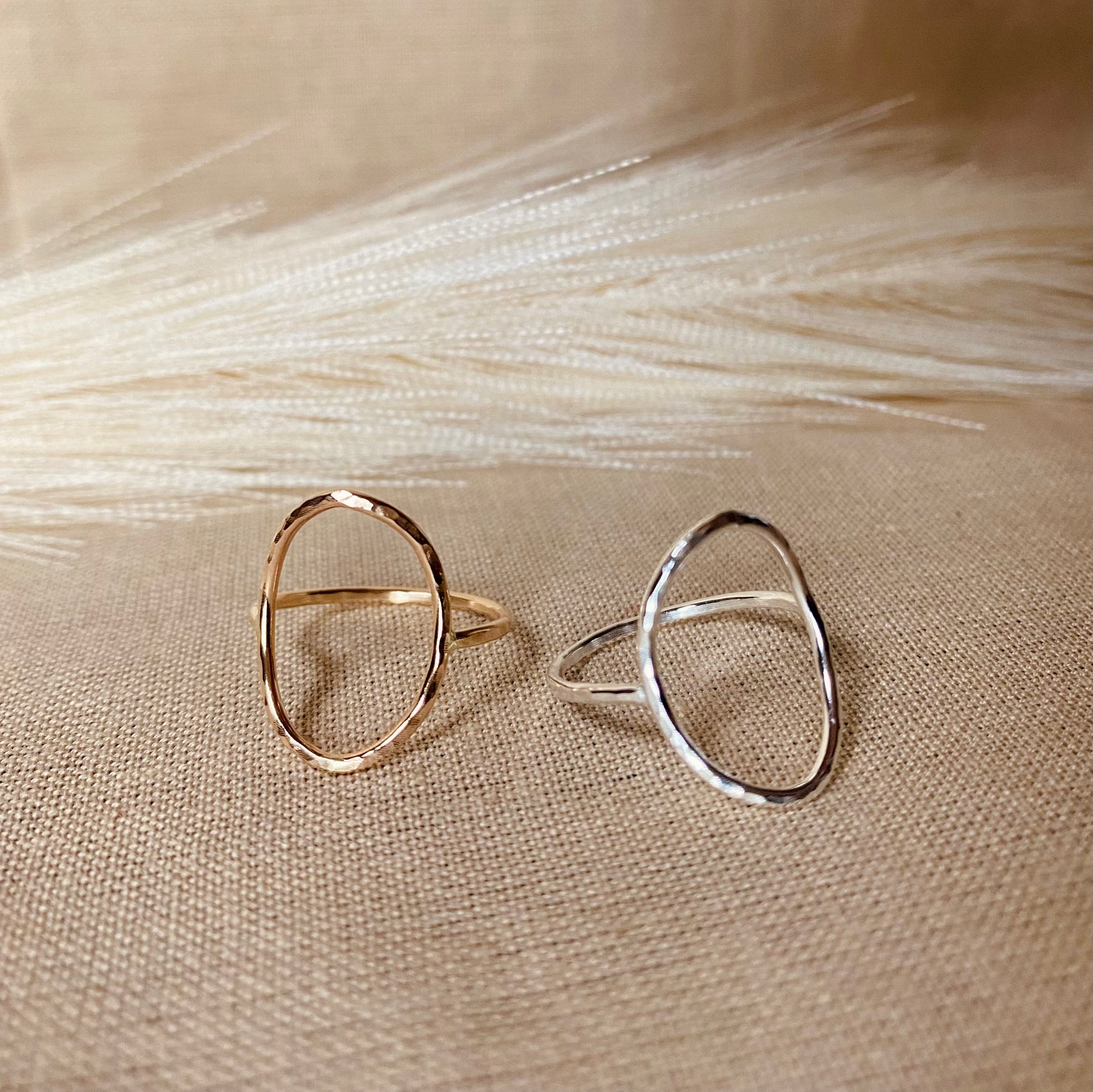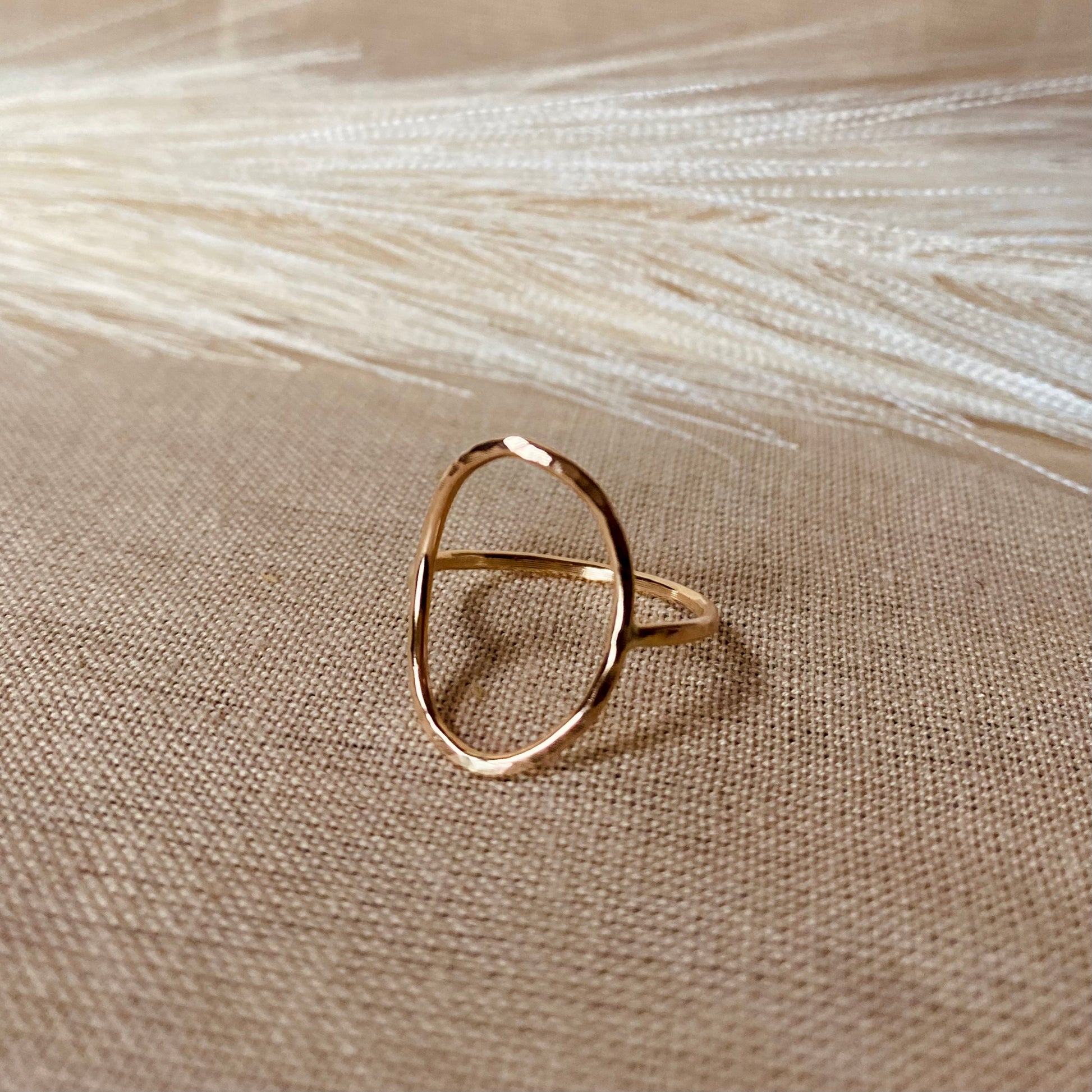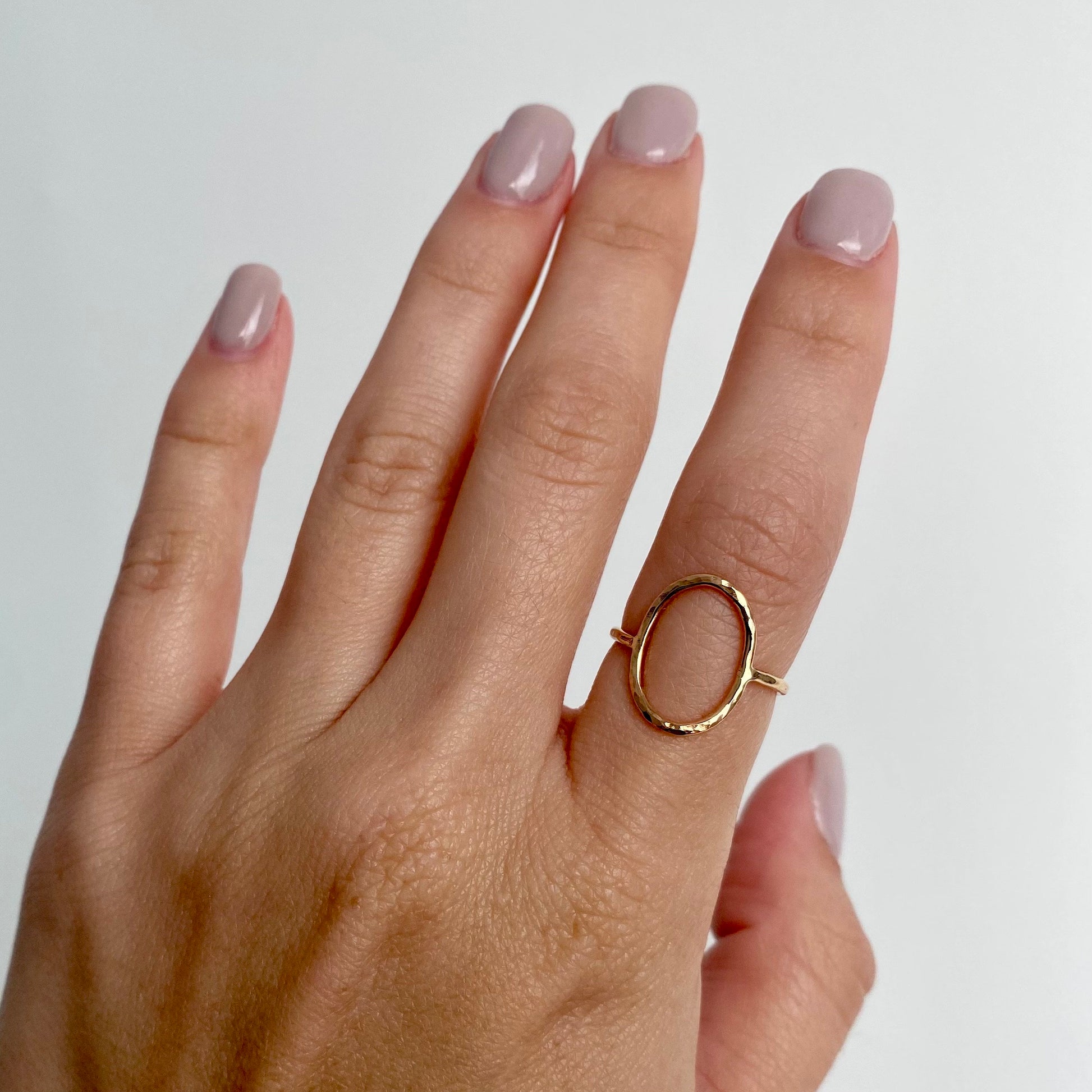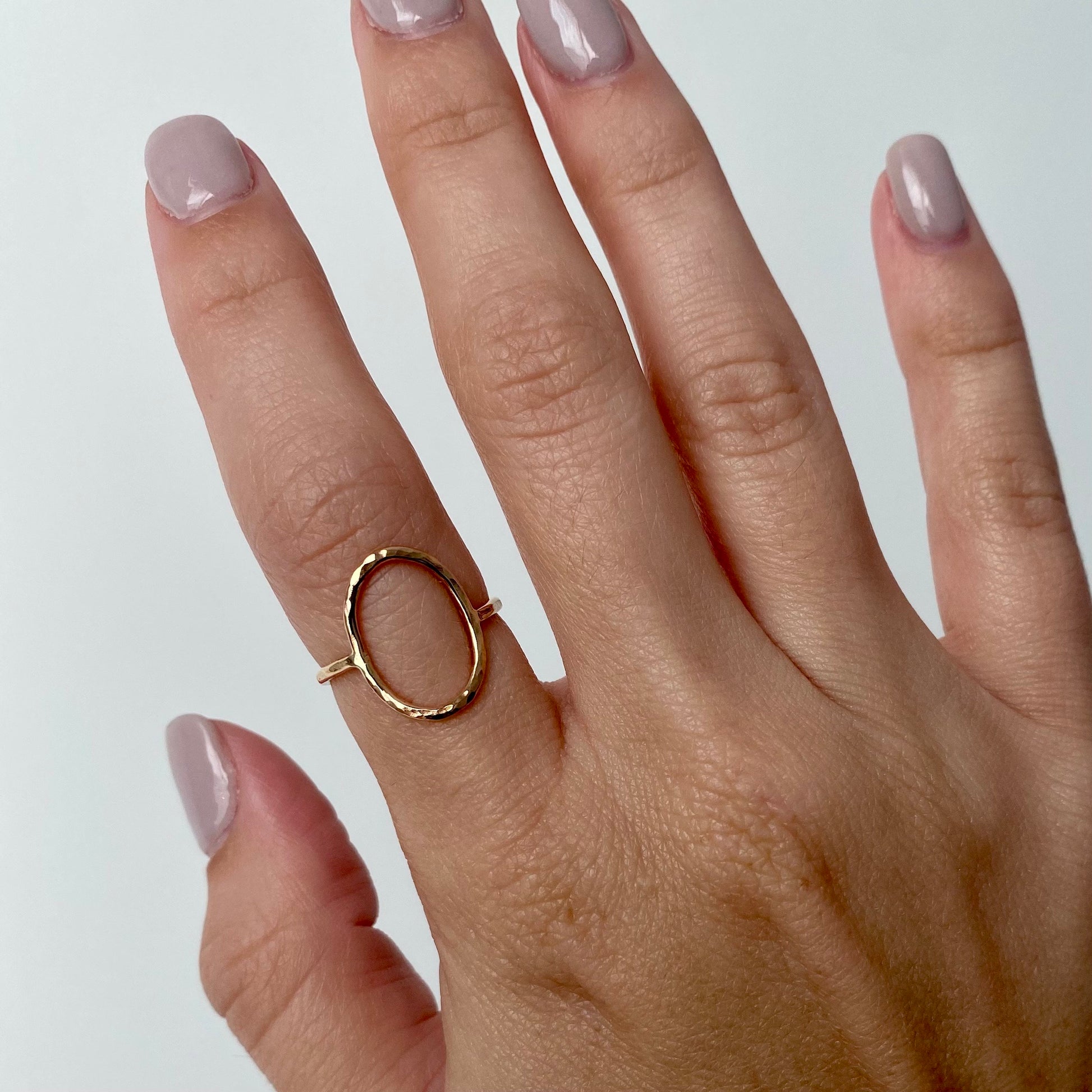 Gorgeous Open Oval Ring with a Hammered Finish. The item come in two metals 14k Gold Filled and Sterling Silver. Great to pair it with accent stacking rings for a fuller modern look.