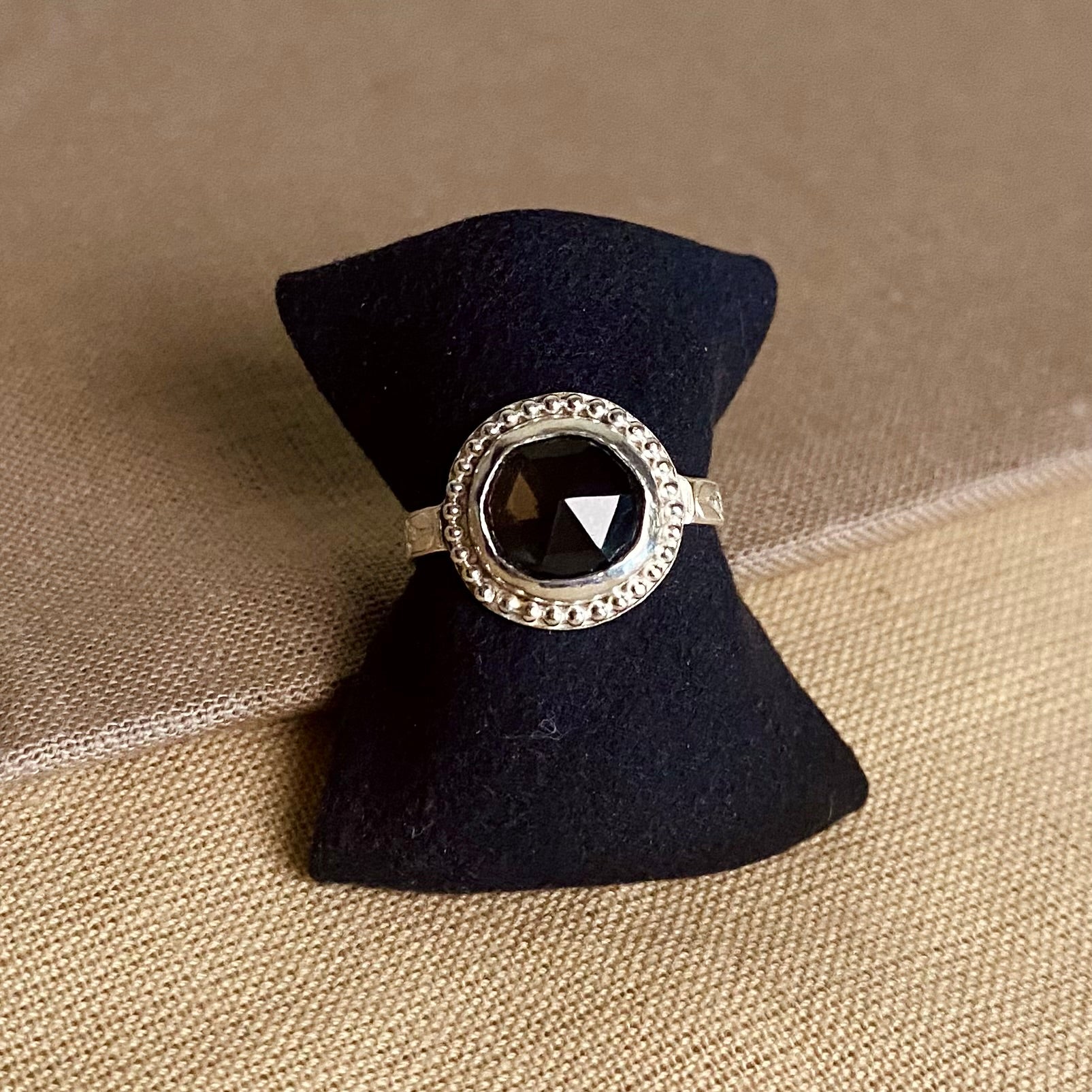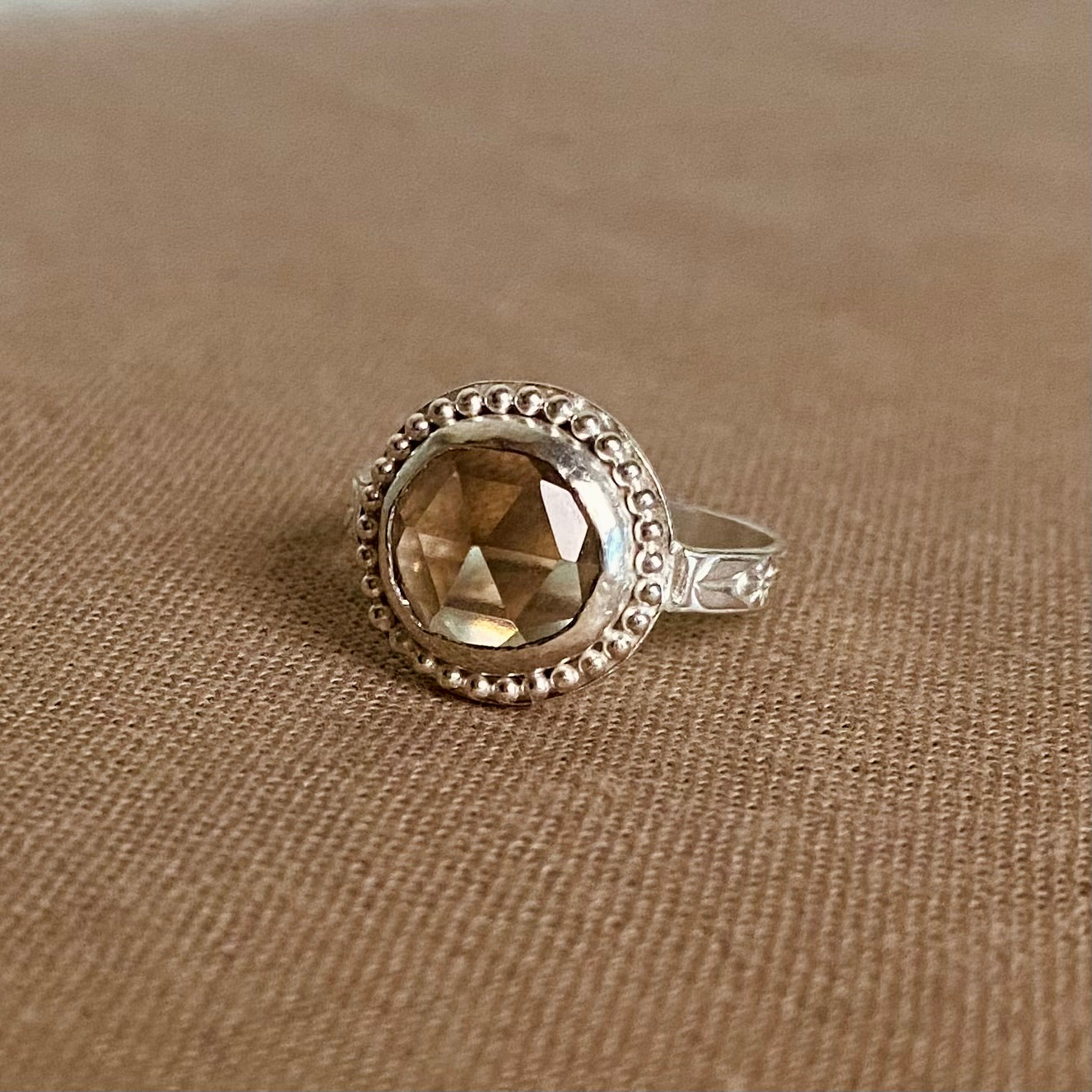 A bold 10 x 10mm natural smoky quartz set in a bezel floral band, a stunning statement ring!