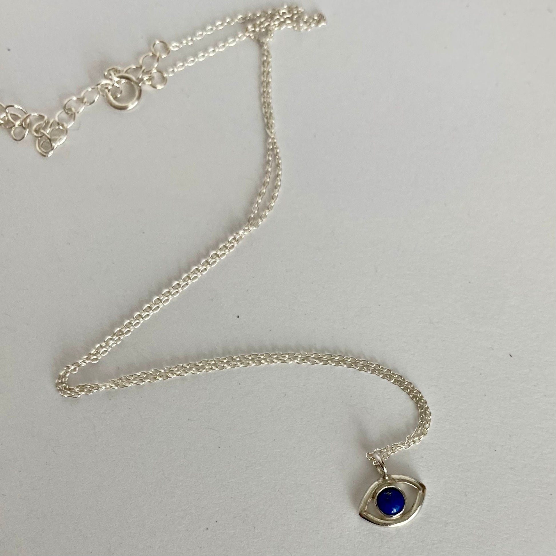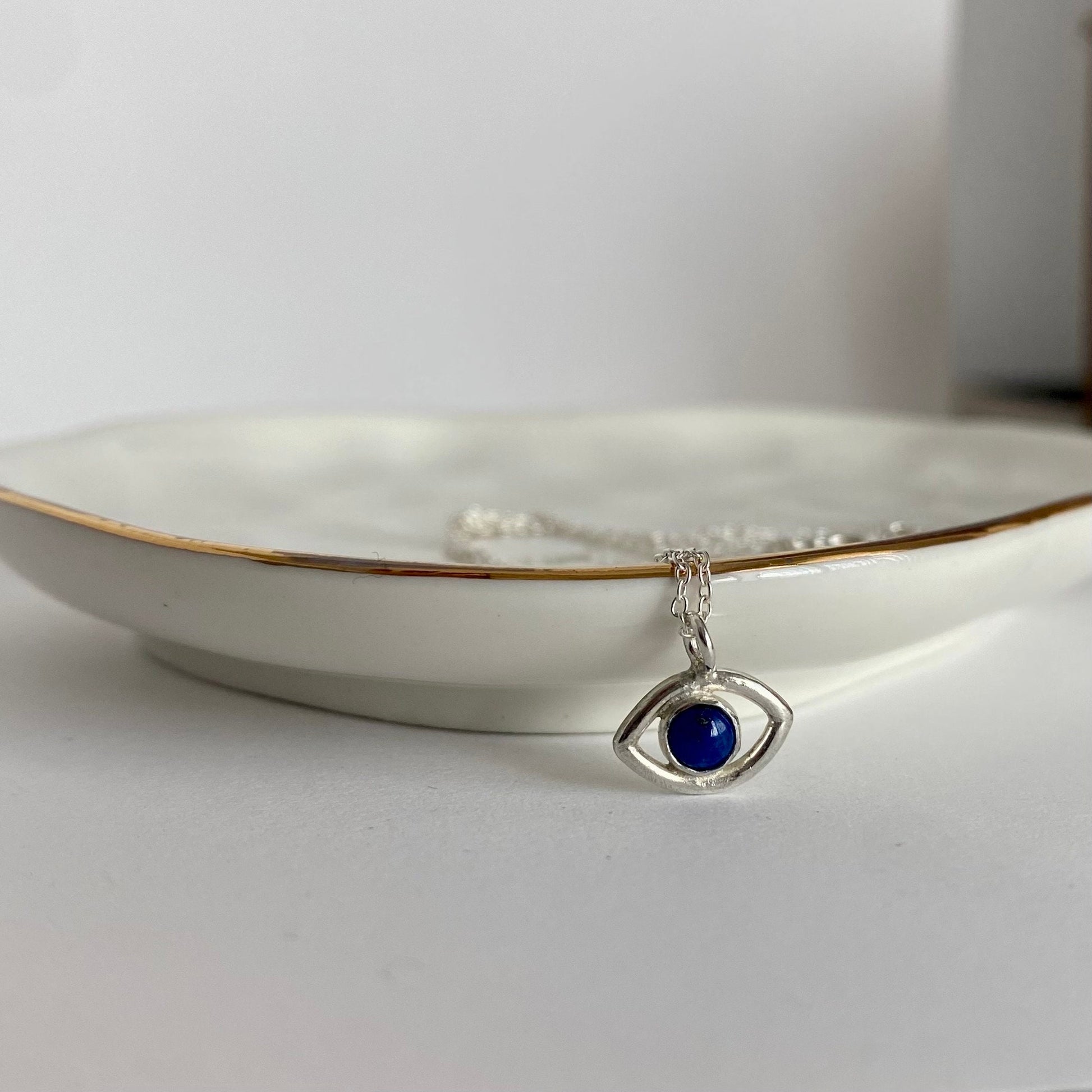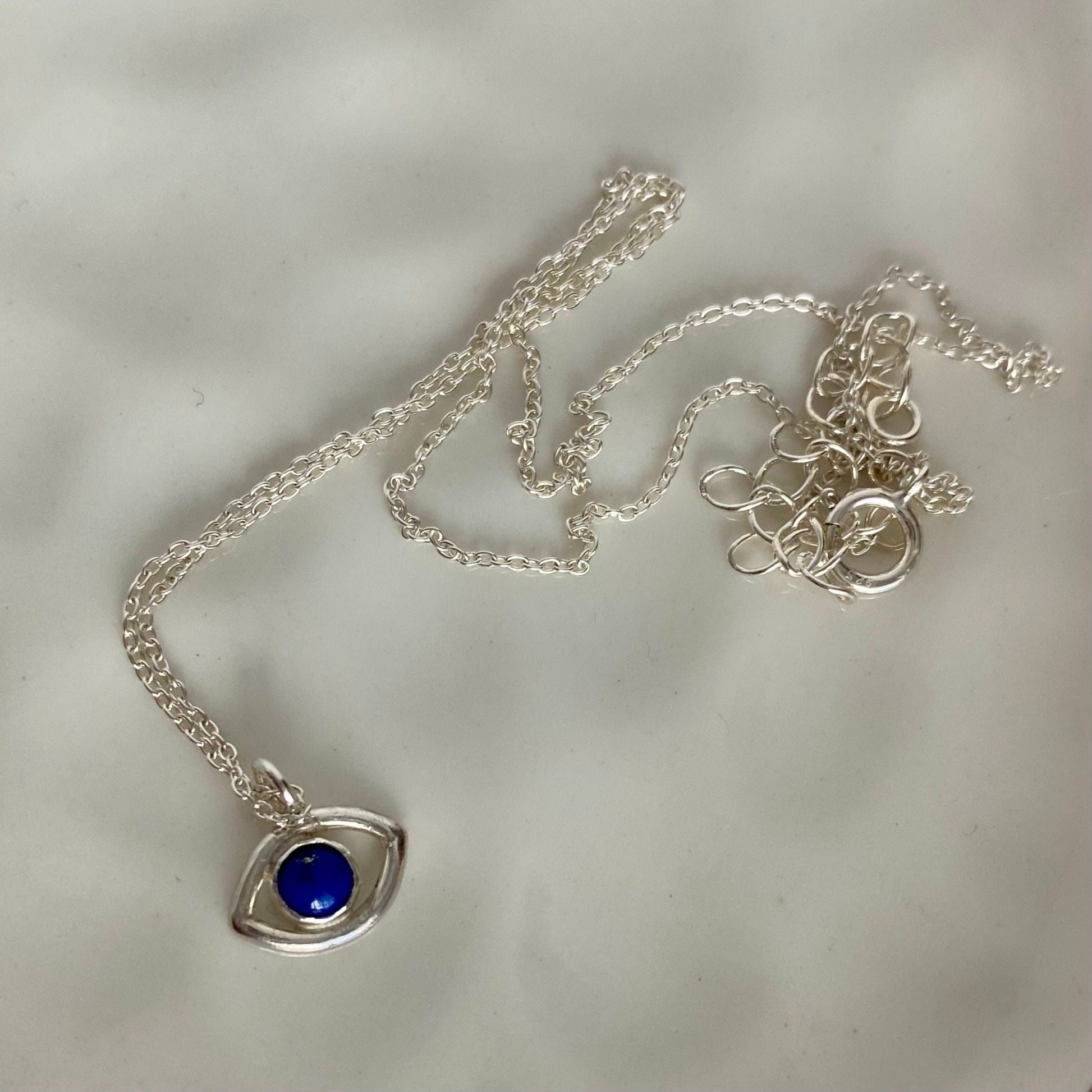 This minimalist evil eye necklace is made of .925 sterling silver with a blue lapis lazuli stone set in the center. Great to pair with any dainty sterling silver chain and clasp.